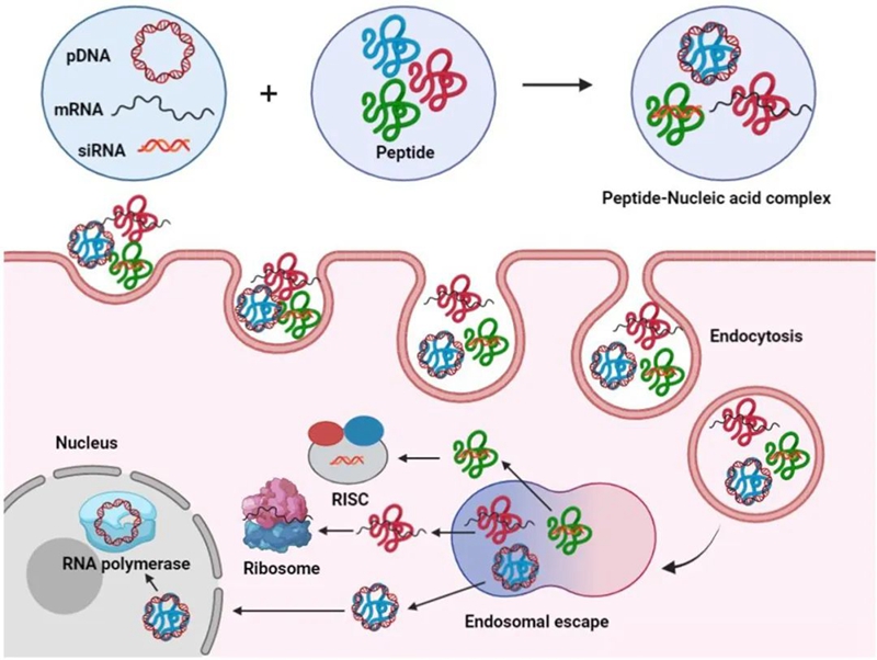 圖1. 多肽遞送質粒DNA(pDNA)、mRNA、siRNA的示意圖。多肽先與核酸通過靜電作用形成納米顆粒復合體,通過內吞作用將其轉運到細胞內,再從內涵體逃逸,將核酸釋放到細胞質或細胞核內。
