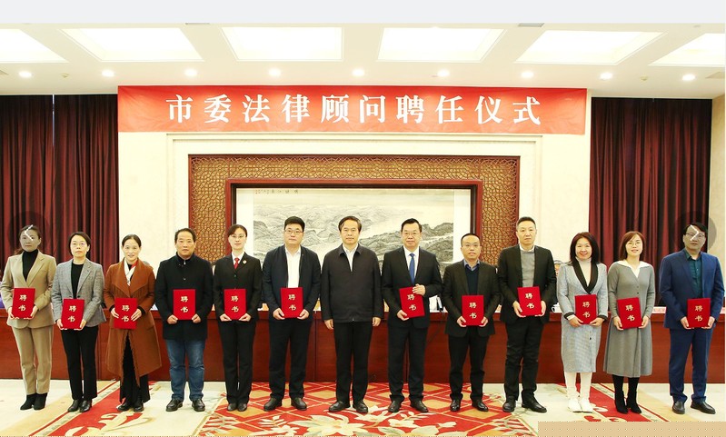 杭勇向專家、律師頒發第二屆市委法律顧問聘書。他希望大家各展所長獻計策,共同協力助法治,充分發揮市委智囊團作用,助推市委“532發展戰略”和新能源之都建設。